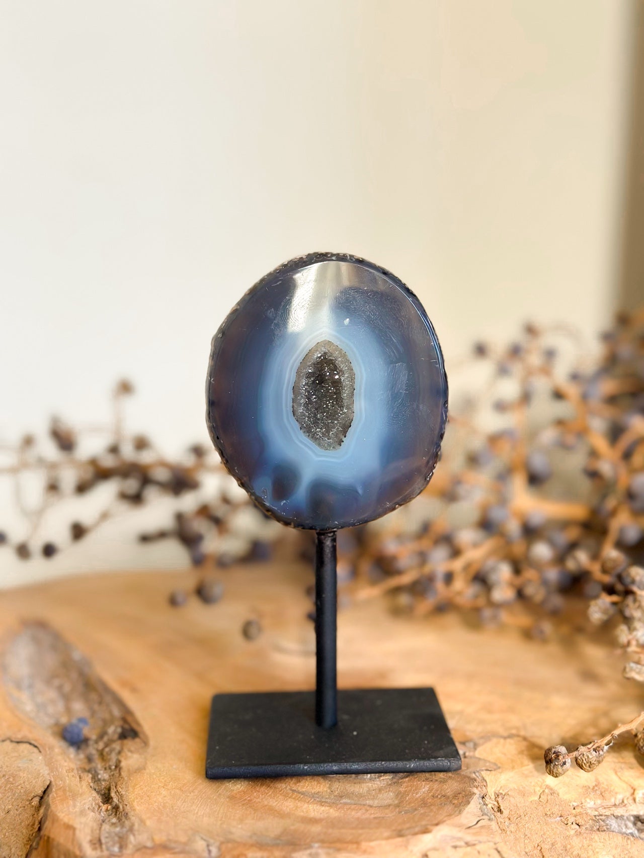 Breng een stukje natuur en rustgevende energie in je ruimte met deze prachtige agaat op standaard.