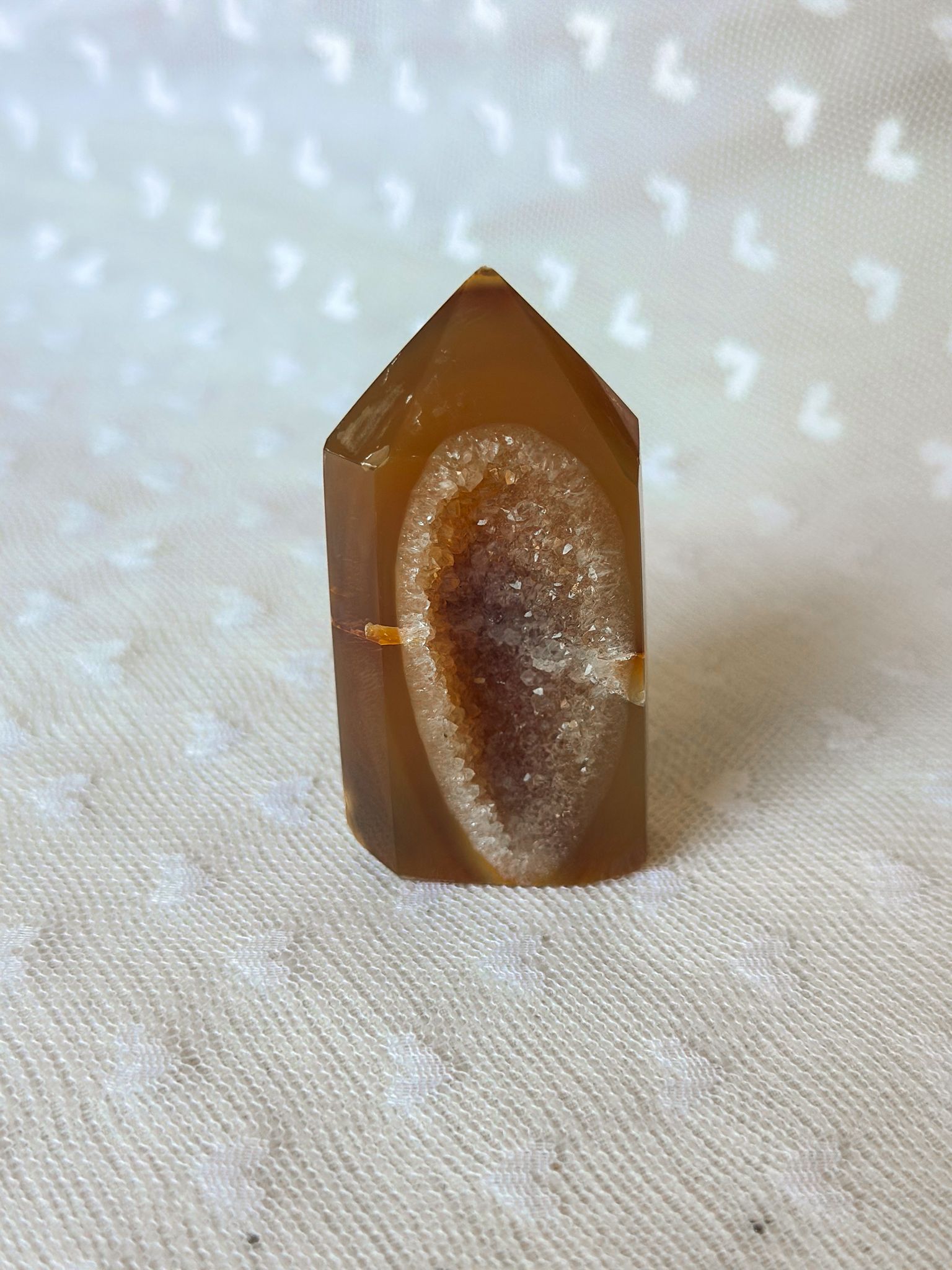 Deze agaatpunt werkt harmoniserend, aardend en beschermend. Hij helpt je om je eigen energie te behouden te midden van chaos, zonder jezelf af te sluiten. Daarbij bevordert hij ook zelfvertrouwen, geduld en kalmte – alsof hij je fluistert dat er geen haast is, en dat stabiliteit van binnenuit groeit.