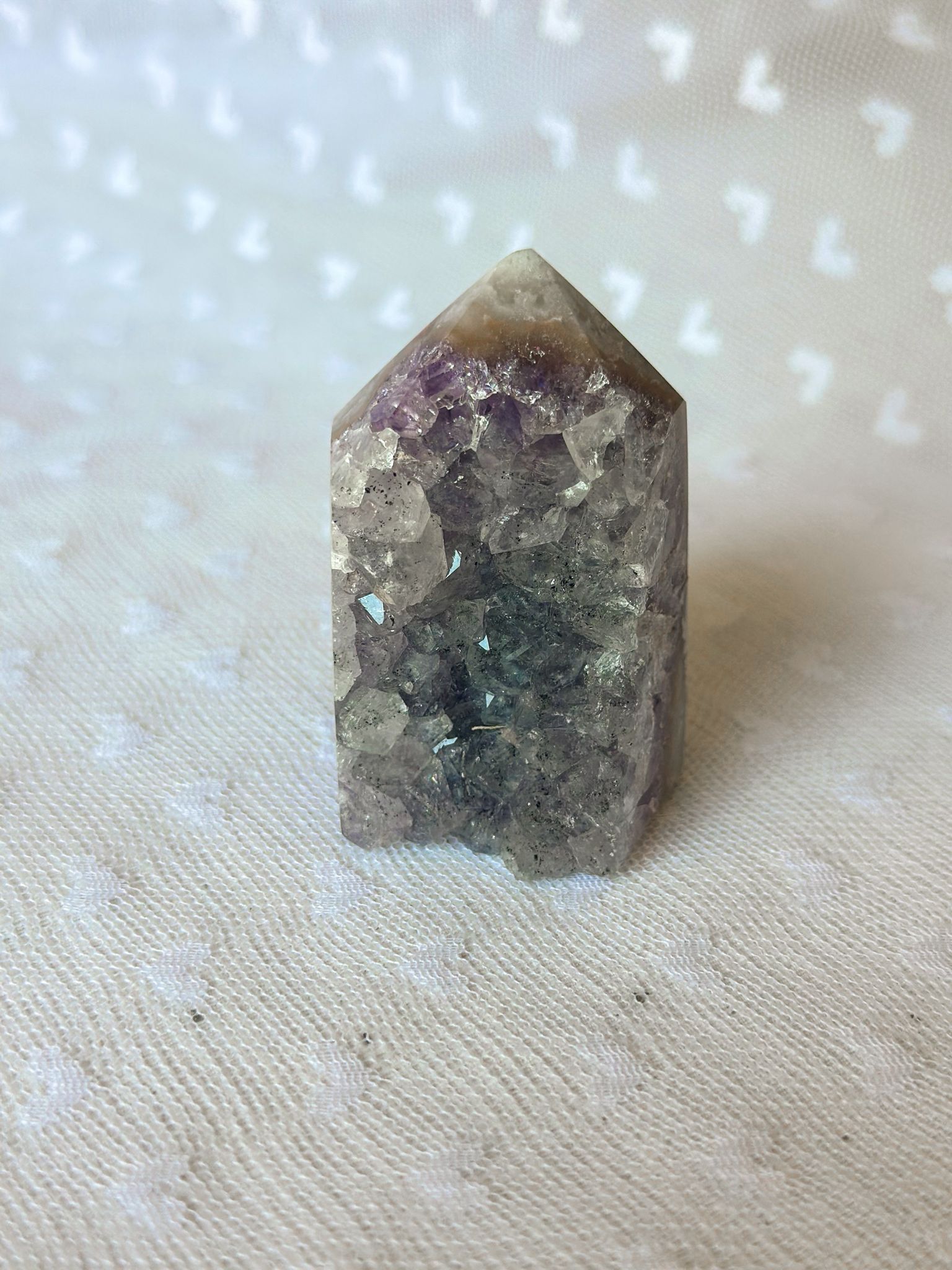 Deze amethist punt straalt een diepe, kalmerende energie uit. Ze nodigt je uit om te vertragen, te zakken in je lichaam en je te verbinden met de stille wijsheid die in jou leeft. Een geliefde steen voor wie rust zoekt, dieper wil voelen en zich wil afstemmen op het hogere.