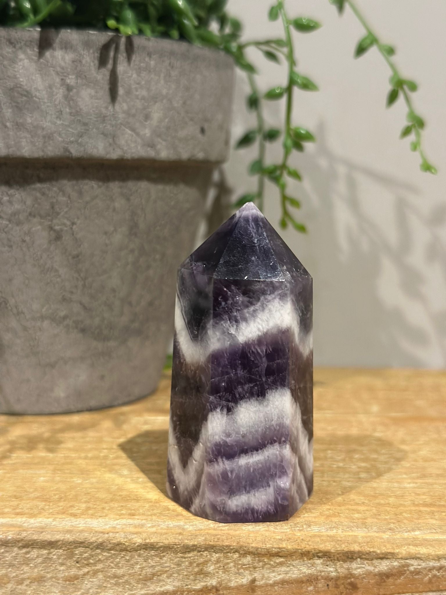Deze amethist punt straalt een diepe, kalmerende energie uit. Ze nodigt je uit om te vertragen, te zakken in je lichaam en je te verbinden met de stille wijsheid die in jou leeft. Een geliefde steen voor wie rust zoekt, dieper wil voelen en zich wil afstemmen op het hogere.