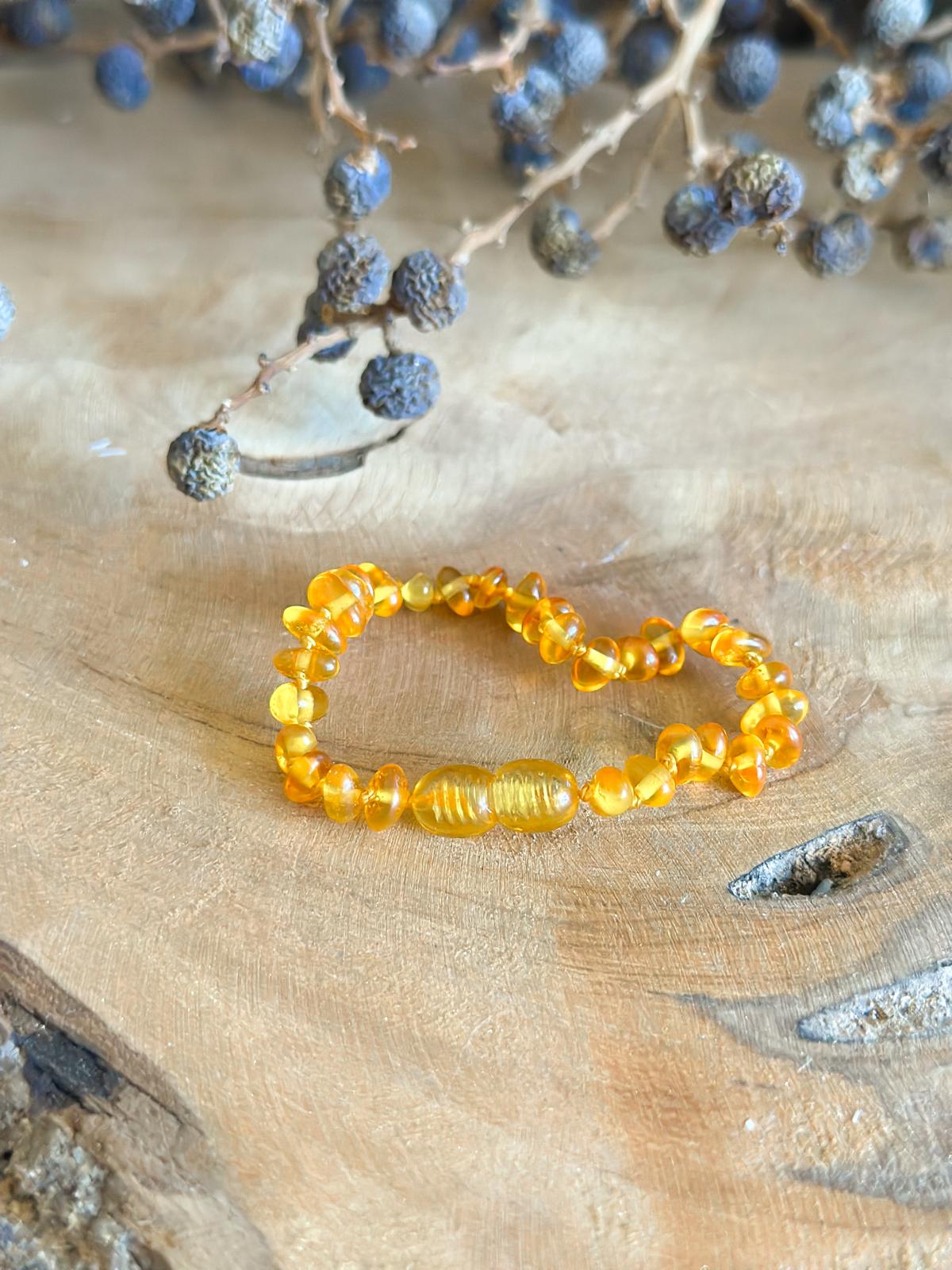 Deze lichtgekleurde barnsteen armband is niet alleen prachtig om te zien, maar staat ook bekend om haar verzachtende werking bij kleintjes. Barnsteen (amber) is een fossiele hars die al eeuwenlang wordt gebruikt om ongemak bij doorkomende tandjes te verlichten en innerlijke rust te bevorderen.