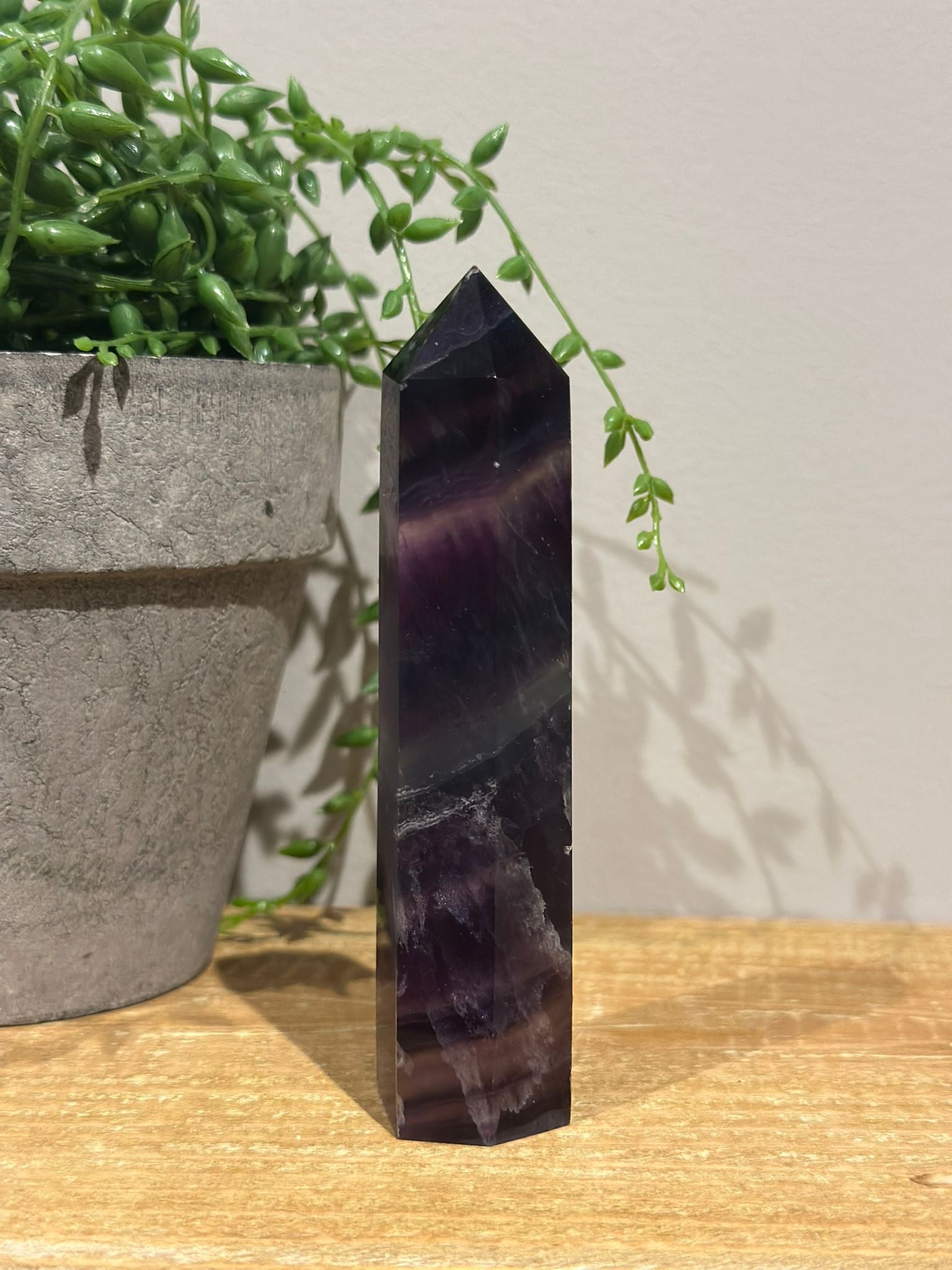 In deze gepolijste puntvorm werkt fluoriet gericht en versterkt. Richt haar naar boven voor helderheid en verbinding met hogere energieën, of naar beneden voor diepe aarding en focus. Een krachtige tool voor meditatie, energetisch werk of simpelweg als rustgevend anker in je ruimte.