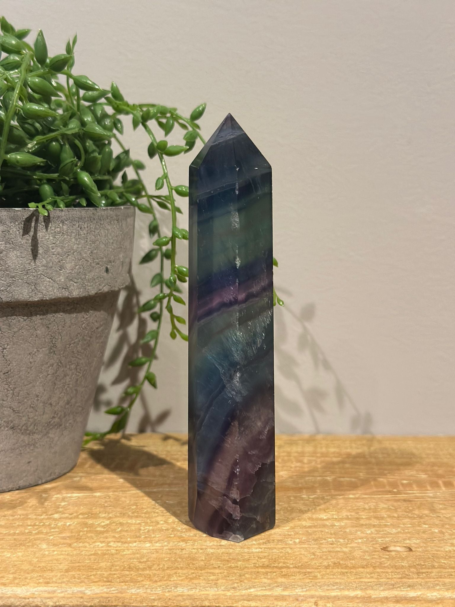 In deze gepolijste puntvorm werkt fluoriet gericht en versterkt. Richt haar naar boven voor helderheid en verbinding met hogere energieën, of naar beneden voor diepe aarding en focus. Een krachtige tool voor meditatie, energetisch werk of simpelweg als rustgevend anker in je ruimte.