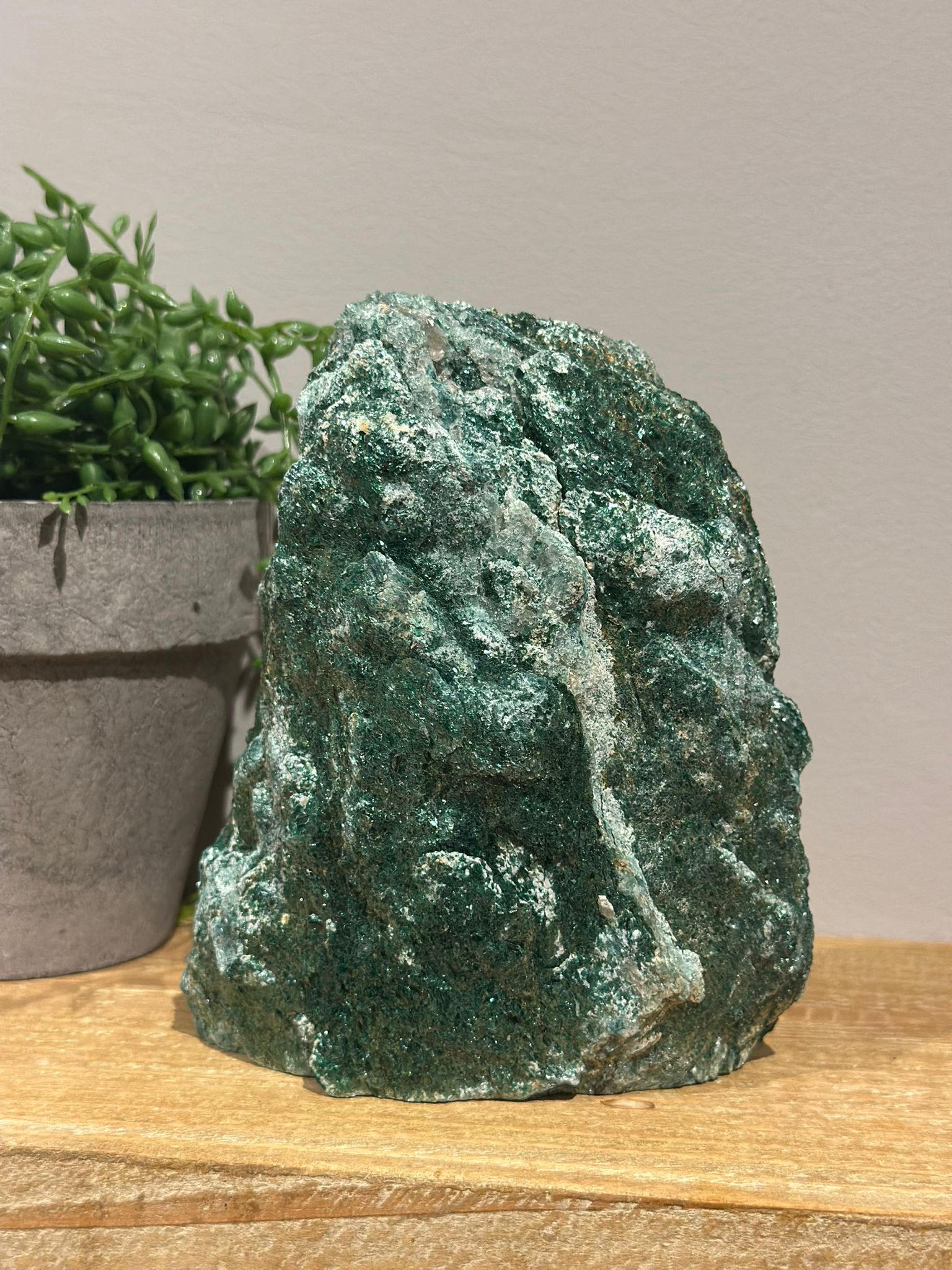 Elke ruwe fuchsiet steen is uniek, met haar intense groene en zilveren glans die kracht en schoonheid uitstraalt.