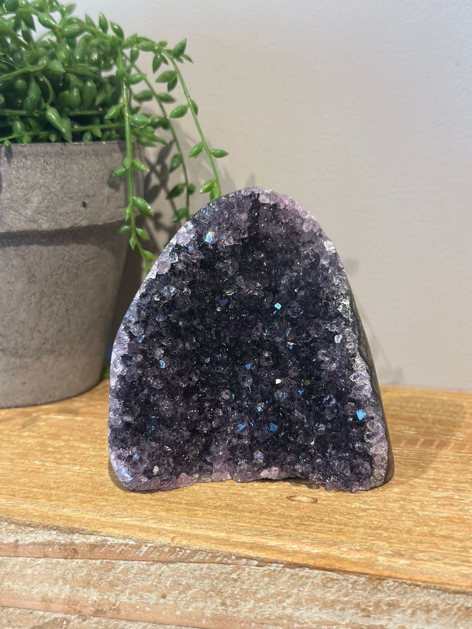 Het vlakke onderstuk zorgt ervoor dat deze steen stevig staat, waardoor je hem gemakkelijk een vaste plek kunt geven in je huis of heilige ruimte. De natuurlijke kristalstructuur straalt kracht uit, terwijl de glinsterende insluitsels een bijna sterrenhemel-achtig effect geven. Een echte blikvanger met een hoge vibratie.