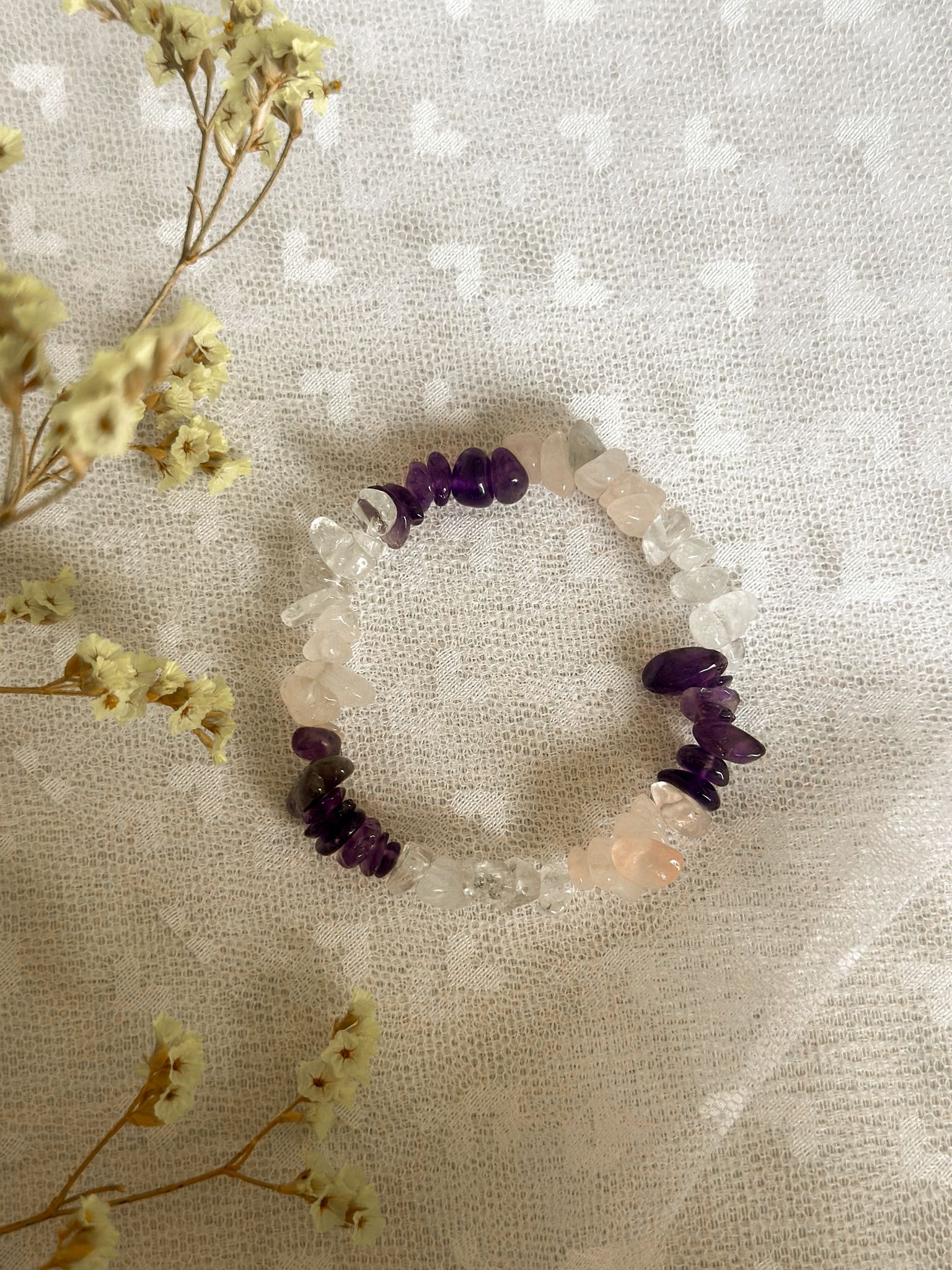 Deze splitarmband van de Gouden Driehoek verenigt drie krachtige edelstenen in één stijlvol en energetisch geheel: Amethist, Rozenkwarts en Bergkristal. Samen vormen ze een beproefde combinatie die bekendstaat om haar diepe werking op lichaam, geest en ziel. De stenen wisselen elkaar speels af in fijne splitkralen, waardoor de armband niet alleen energetisch sterk is, maar ook natuurlijk en elegant oogt.