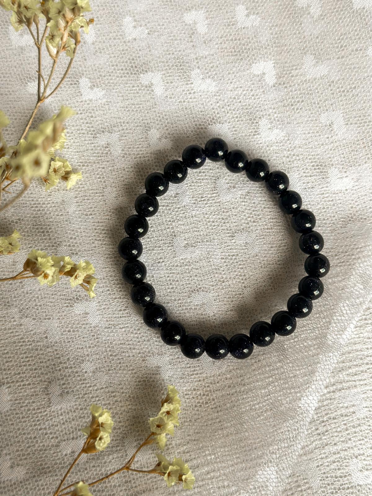 De armband is gemaakt van glanzende, ronde kralen in nachtblauw met een subtiele fonkeling die doet denken aan een sterrenhemel. Geregen op elastisch koord voor een comfortabele pasvorm en geschikt voor dagelijks gebruik.
