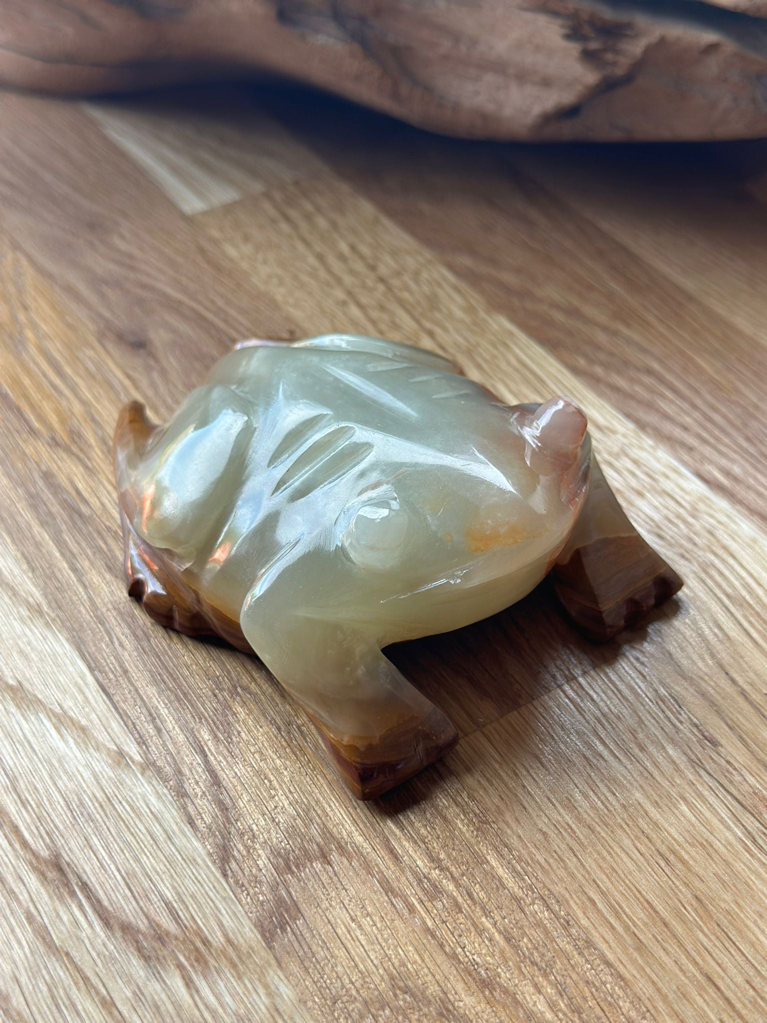 Deze handgeslepen kikker van groene onyx staat symbool voor zuivering, geluk en vernieuwing. De kikker is een krachtig dier in vele culturen en wordt vaak gezien als brenger van transformatie en bescherming. Groene onyx ondersteunt daarnaast innerlijke rust, balans en helpt bij het loslaten van negatieve gedachten. Een prachtig, speels beeldje dat zowel decoratief als energetisch veel te bieden heeft. Mooi op je altaar, nachtkastje of als betekenisvol cadeautje.