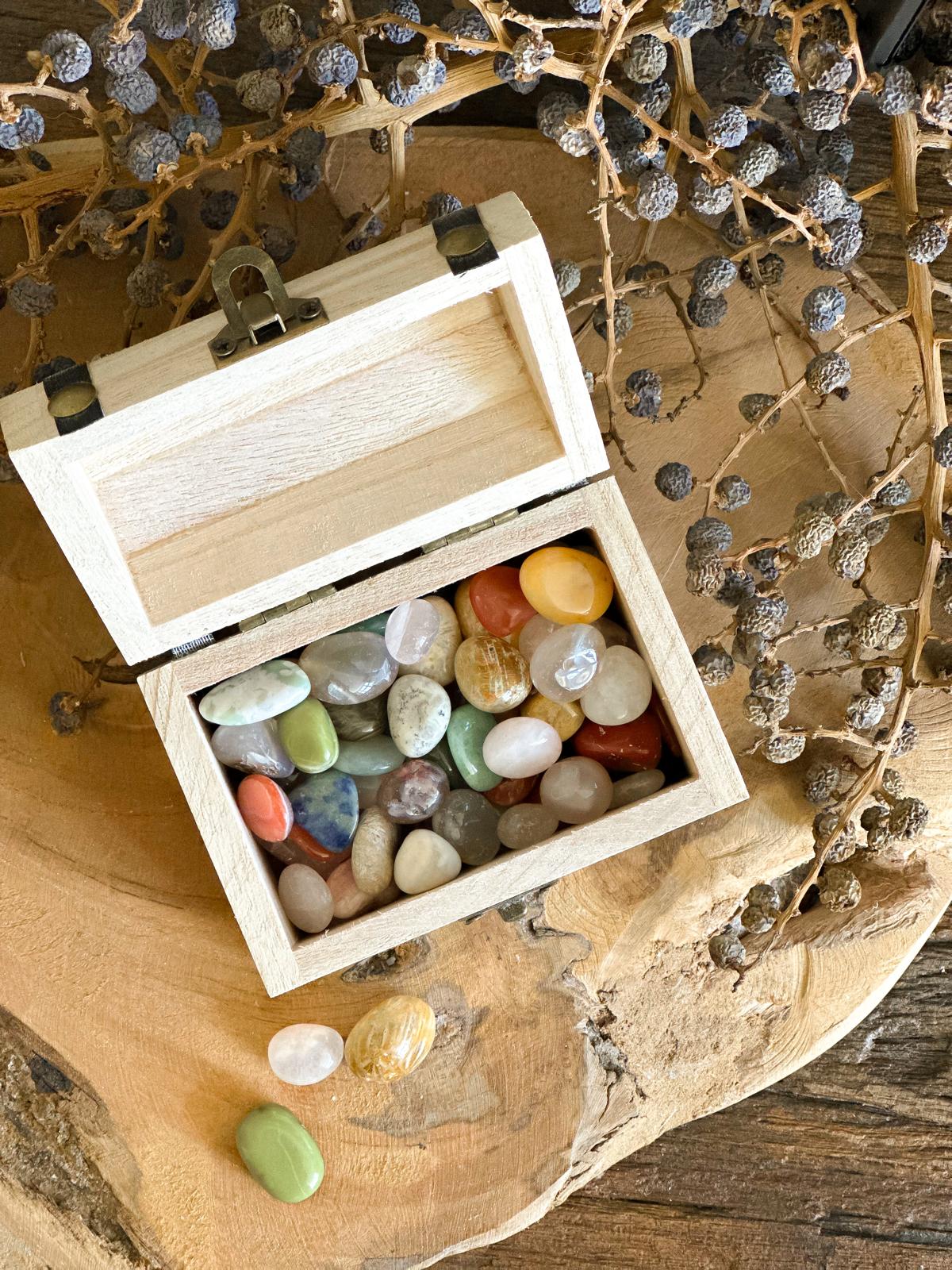 Het schatkistje bevat een gevarieerde mix van edelstenen, zoals amethist, rozenkwarts, citrien en meer. Deze stenen zijn zorgvuldig gekozen om een balans van helende energie, geluk en positieve vibraties te bieden. Of je ze gebruikt voor meditatie, als sieraden of om je huis te verfraaien, elke steen heeft zijn eigen specifieke kracht en betekenis.