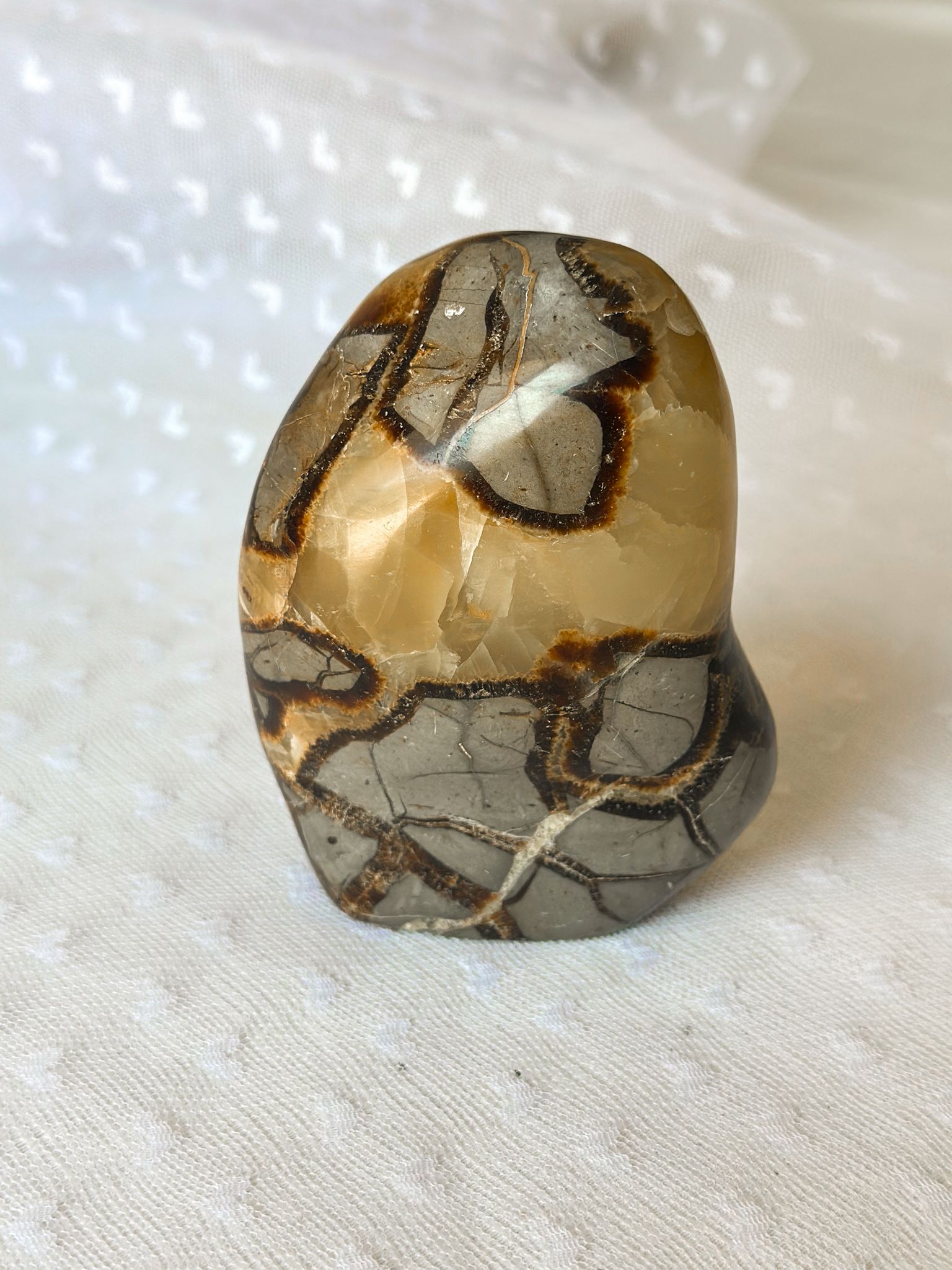 Septaria – ook wel ‘drakensteen’ genoemd – ontstaat door een zeldzaam proces waarbij modder, mineralen en kalksteen in de loop van tijd barsten en opnieuw vullen met kristallen. Elke sculptuur vertelt dus zijn eigen verhaal; geen twee stukken zijn ooit hetzelfde. In energetische zin draagt Septaria de trilling van diepe, stille wijsheid. Het is een steen die helpt om in contact te komen met je innerlijke waarheid, en die je tegelijkertijd beschermt en ondersteunt bij het spreken van die waarheid naar buiten toe.